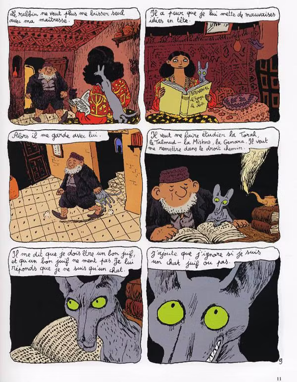 Celui qui regarde ce monde et qui raconte, c’est "Le Chat du Rabbin". Tout de suite, il explique pourquoi le Rabbin n’a pas plutôt un chien :"ça fait tellement longtemps que les juifs se font mordre, courir après ou aboyer dessus que, finalement, ils préfèrent les chats". Le chat mange le perroquet de Zlabya, la fille du Rabbin, et du coup, le voilà doté de la parole et exigeant de faire sa bar-mitsva. Les discussions vont être longues tant avec le Rabbin lui-même qu’avec le Rabbin du Rabbin.