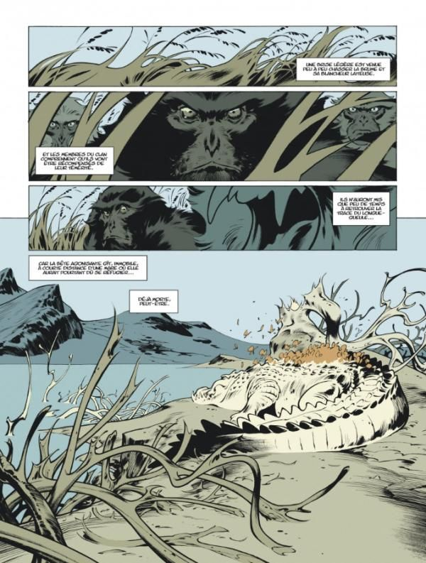 Remontez jusqu’à l’ère lointaine du Déluge, celle qu’évoquent à demi-mots tous les textes anciens de l’humanité... En ces temps de famine, Sans-Voix, un jeune singe orphelin, cherche à prouver sa valeur à son clan d’adoption en chassant le « longue-gueule », un vieil alligator blessé et vicieux. Manger ou être mangé : le cycle immuable de la nature. Mais en osant s’aventurer au coeur des terres interdites, celles des humains, Sans-Voix sera confronté au plus cruel des destins : voir les siens massacrés sous ses yeux avant d’être capturé puis dressé dans les arènes de l’Empire afin de devenir un « Dieu-Fauve », un guerrier sacré façonné pour la violence et l’art du combat. Mais ces longues années de souffrance auront surtout fait grandir en lui une brûlante obsession : se venger de ses bourreaux, quel qu’en soit le prix. Récit de bruit et de fureur, empreint d’une poésie sauvage, Le Dieu-Fauve dresse le portrait d’une civilisation soudainement confrontée à la perspective de sa disparition. Mettant les nerfs à vif, cet album donne à voir et à ressentir la violence de la nature, la chaleur étouffante, le bourdonnement des insectes, les cris de rage et les larmes de désespoir des protagonistes, croquant avec force le ballet incessant qui fait s’entrelacer la vie et la mort, le règne animal et l’humanité. Car, au fond, qui est le réel héros de cette histoire ? L’homme ou... l’animal ? Une oeuvre à la construction magistrale, écrite par Fabien Vehlmann et portée par le dessin spectaculaire de Roger.